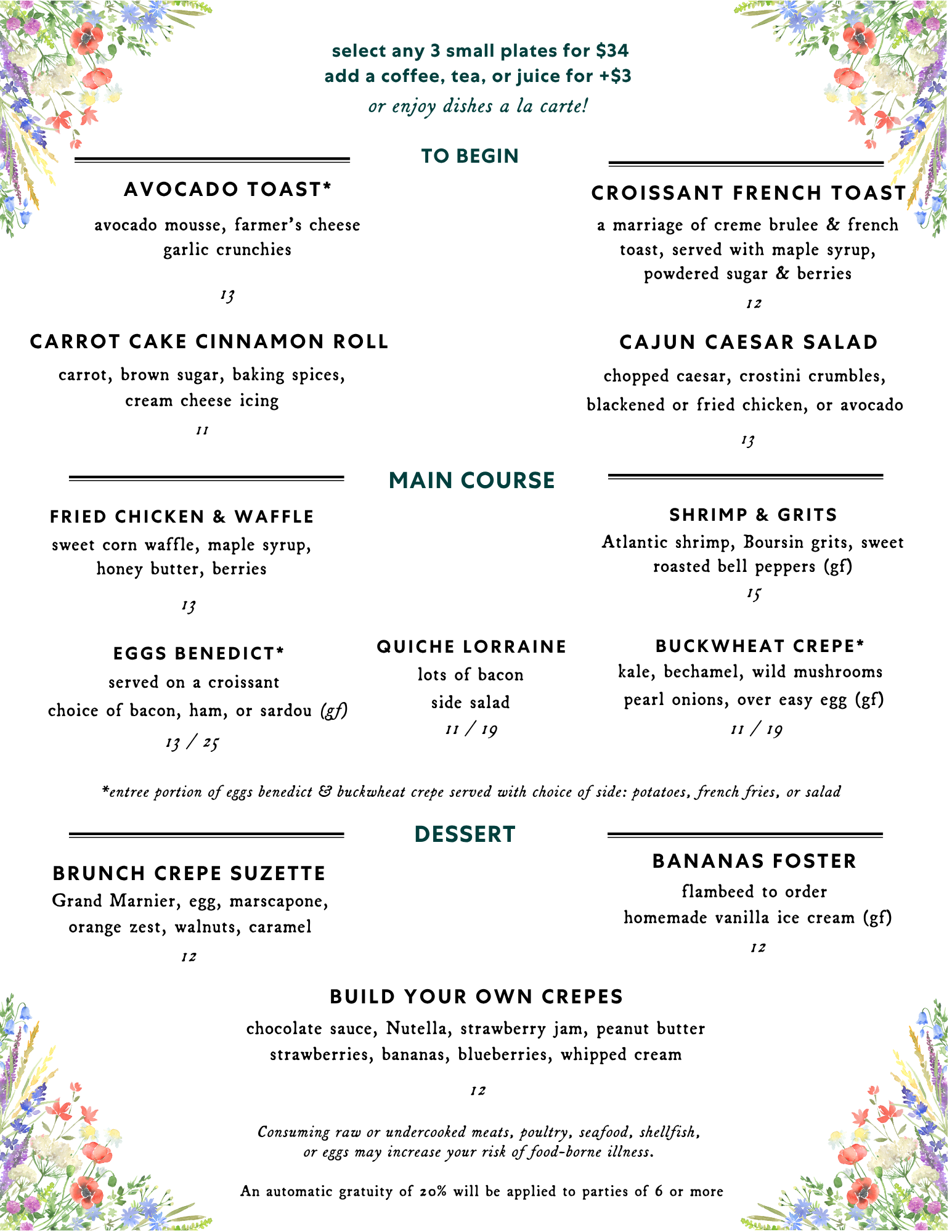 $34 per person, not including beverages, tax, or gratuity. Reservations highly recommended! Reserve your table here or below