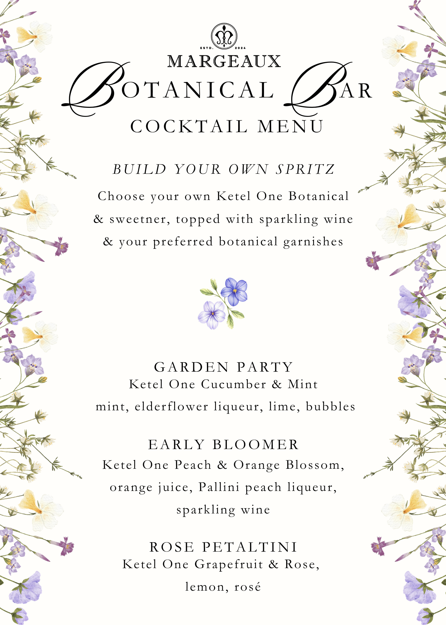 Join us at Margeaux on Saturday, May 9th from 1 to 5 PM for an afternoon blooming with flavor in partnership with Ketel One Botanicals. Guests will have the opportunity to personalize their drinks at our Botanical Garnish Bar with edible flowers, dehydrated fruits, cocktail glitter, and other playful finishing touches.